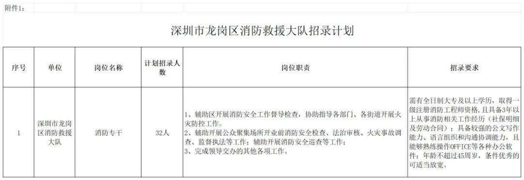 具体岗位详见《深圳市龙岗区消防救援大队招录计划》(附件1)。