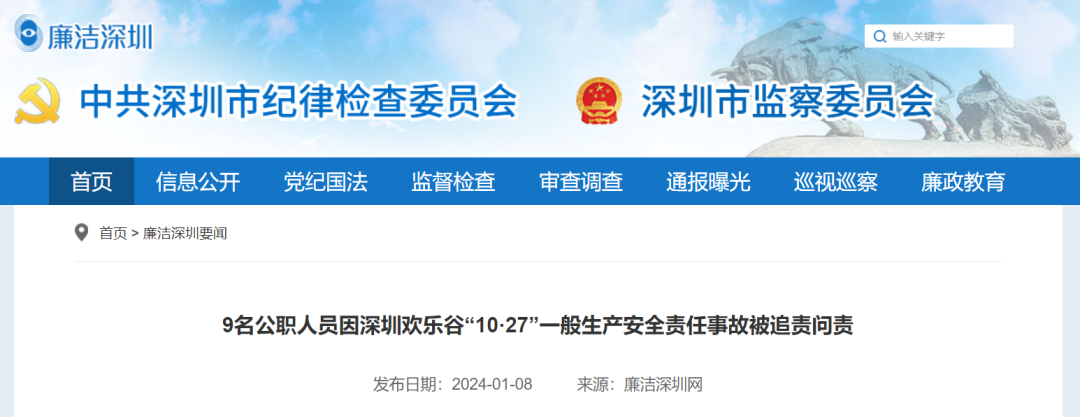 近日,深圳市人民政府事故调查组公布调查报告,认定深圳欢乐谷“10•27”过山车碰撞事故是一起因企业安全主体责任落实不到位、事故设备维护不善等原因造成的一般特种设备责任事故。事故调查组对12名责任人员和相关责任单位提出了处理建议,其中3人建议移送司法机关处理。