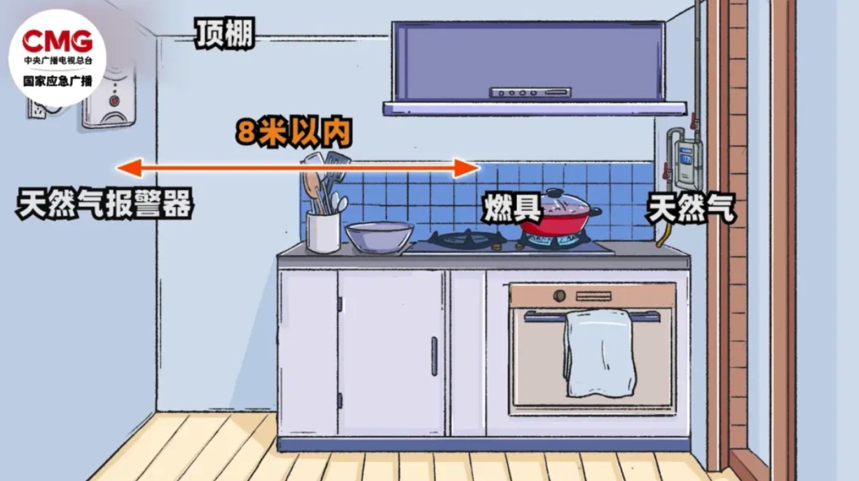 燃气报警器应安装在靠近燃气表或燃气管道连接点的位置,避免在橱柜等封闭空间安装,也不宜安装在灶具正上方,温度过高、气流过大,都可能造成燃气报警器的误报。
