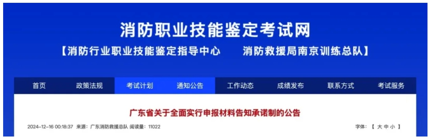 为贯彻落实国家消防救援局《消防救援机构便民利企八项措施》(消防〔2024〕43号),坚持高效便民、优化申报流程,依据《人力资源社会保障部关于取消部分规范性文件设定的证明材料的决定》(人社部发〔2019〕20号)等政策文件要求,自2024年12月16日零时起全面实行申报材料告知承诺制,对于符合《消防设施操作员国家职业技能标准(2019年版)》相关专业和职业要求的报名人员,需提供身份证明、学历证明及申报承诺书等申报材料。现就工作具体安排和有关事项公告如下: