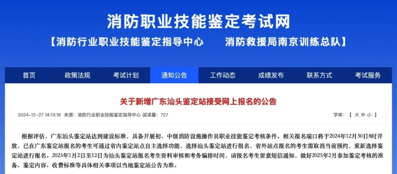 根据评估,广东汕头鉴定站达到建设标准,具备开展初、中级消防设施操作员职业技能鉴定考核条件。相关报名端口将于2024年12月30日8时开放,已在广东鉴定站报名的考生可通过省内鉴定站点自主选择功能,选择汕头鉴定站进行报名,省外站点报名的考生需取消当前预约,重新选择鉴定站进行报名。2025年1月2日至12日为汕头鉴定站报名考生资料审核和考务编排时间,请报名考生留意短信通知,做好2025年2月参加鉴定考核的准备。鉴定内容、收费标准等具体相关事项以当地鉴定站公告为准。